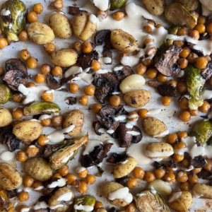 - In a large bowl, toss together gnocchi, brussel sprouts, mushrooms, chickpeas, garlic, oregano, garlic powder, balsamic vinegar, olive oil, salt, pepper until well combined. Lay evenly on sheet pans and roast for 25-27 minutes, flipping half way through, until gnocchi is golden brown and brussel sprouts are fork tender.